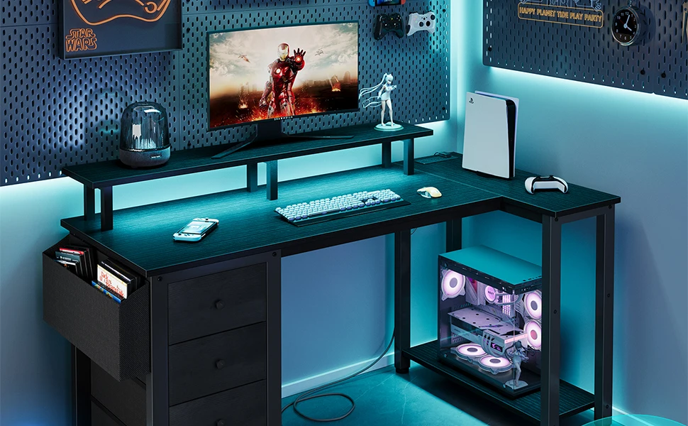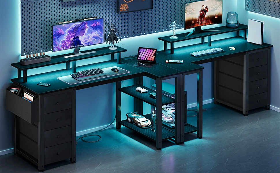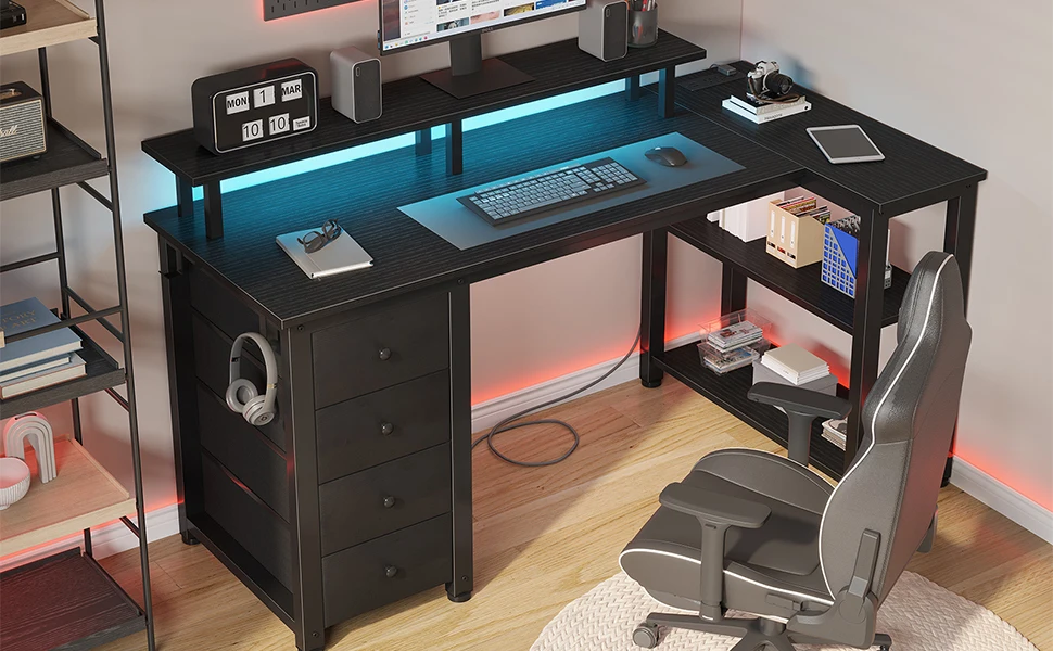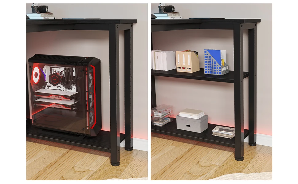 The table with reversible design, the shelving units of the l-shaped desks can be fixed on the left or right side according to the workplace, so it can maximize the space of the corner.